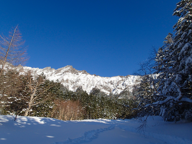 | 阿弥陀岳と中岳のコルに出る夏道沿いにトレースがありますが、雪崩のリスクがありますので、 通る方は積雪状況をしっかり判断してくださいね。 |